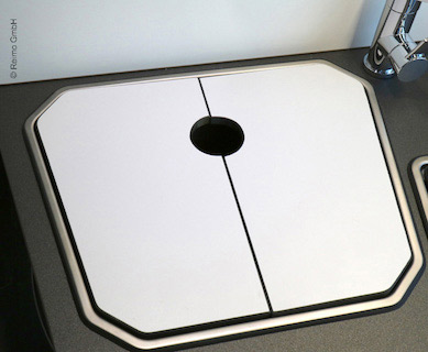 Abdeckung/Schneidebrett zweigeteilt für Adria Axess-Modelle, passend für für Spüle A3950190. Maße: 39,8 x 32 x 0,8 cm. Die Abdeckung wird aus HPL (High Pressure Laminate) Compact in Weiß matt gefertigt.