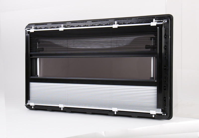 Elegantna in aerodinamična sivo tonirana akrilna šipa se zunaj poravna z okvirjem okna. Notranji okvir z zatemnitvenim plisiranim senčilom zagotavlja maksimalno zasebnost, komarnik pa zanesljivo zaščito pred insekti.