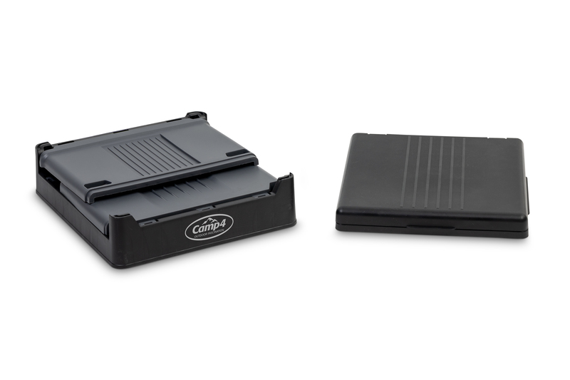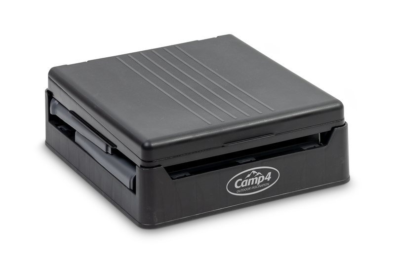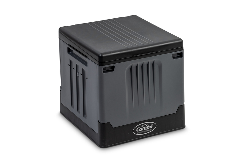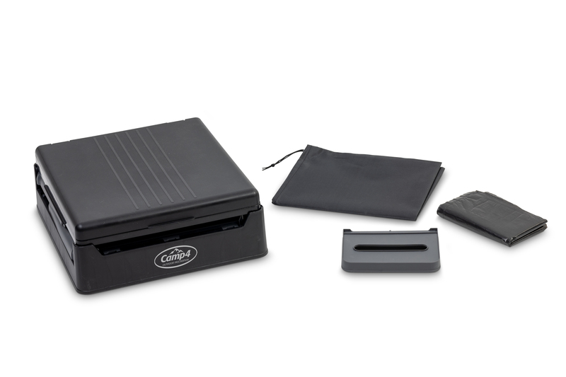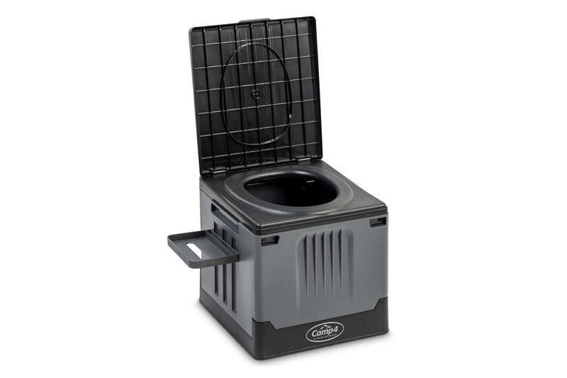 Zložljiva kampirska toaleta v črni/sivi barvi. Hitro in enostavno sestaviti, cca. 1 minuta časa sestave. Obremenitev do 150 kg. Material: PP.