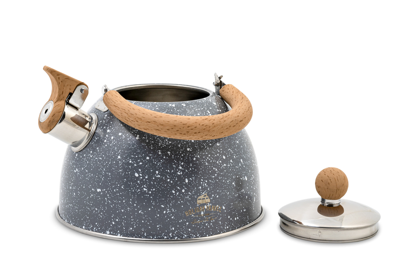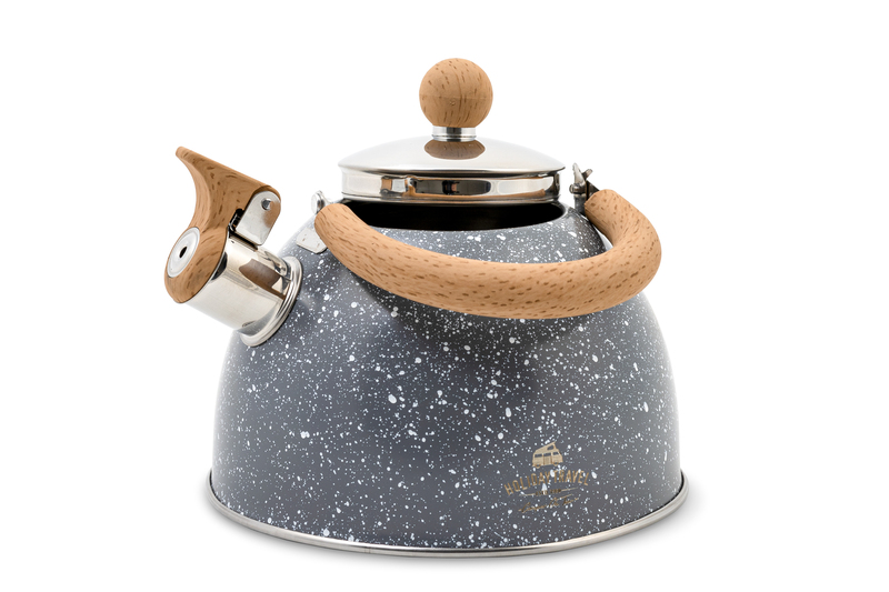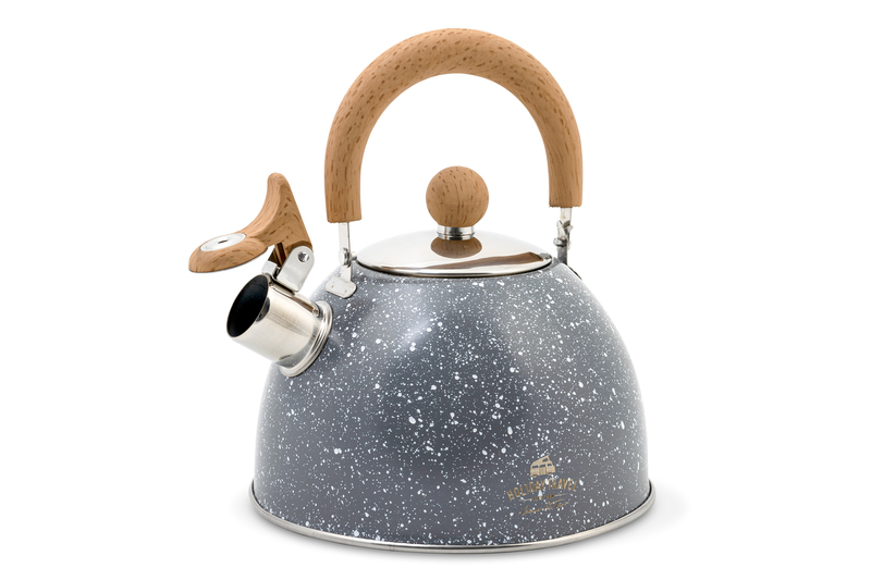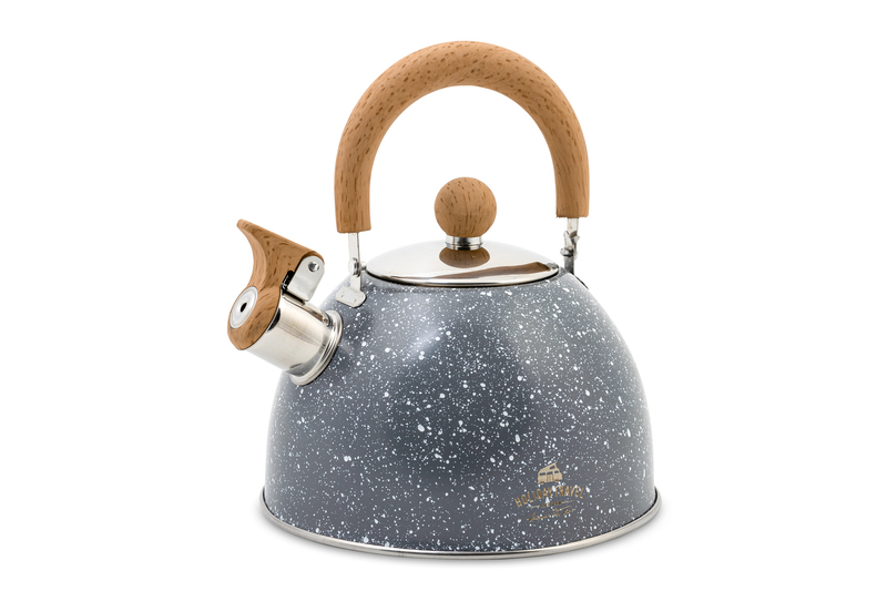Dimenzije: Ø 18 cm, H 15 cm. Material: telo – nerjavno jeklo, dno – aluminij in nerjavno jeklo, ročaj: najlon v lesni optiki. Barva: sivo-stone-look