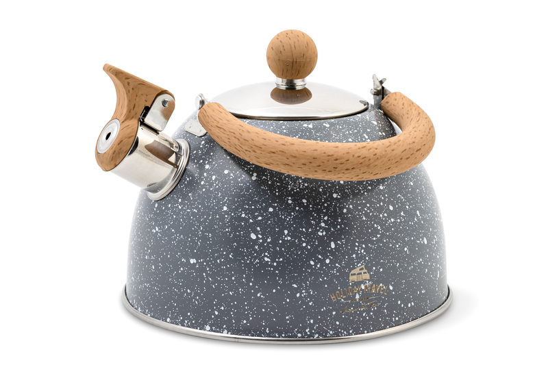 Dimenzije: Ø 18 cm, višina 15 cm. Material: telo – nerjavno jeklo, dno – aluminij & nerjavno jeklo, ročaj: najlon v lesnem videzu. Barva: sivo-stone look.