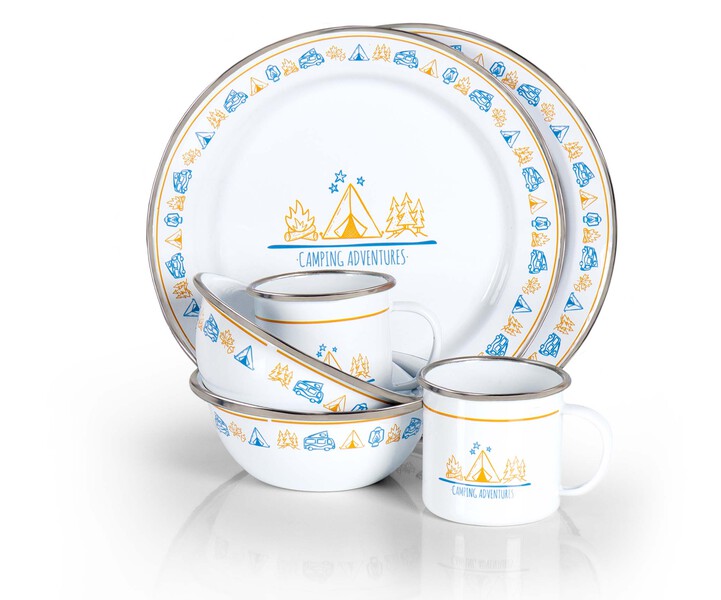 Sklop emajlirane posode za taborni ogenj – 6 kosov – Za 2 osebi