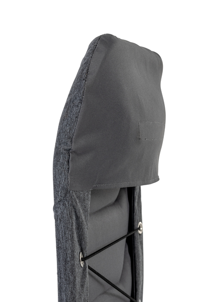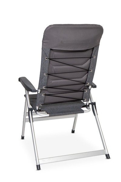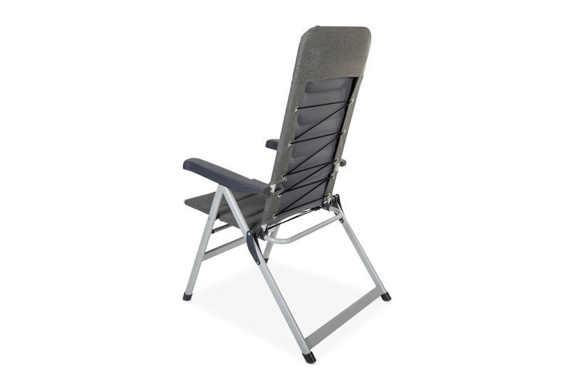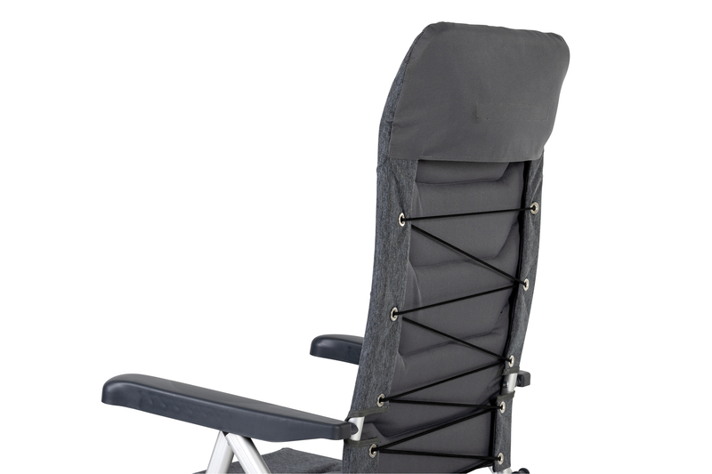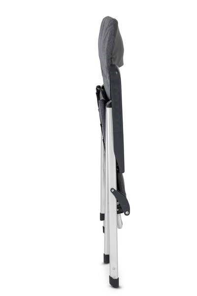 Tkanina: 600D poliester (sivo-meliran), ogrodje: aluminij (mat srebrn), maks. nosilnost 120 kg, sedišče V 47 x Š 52 x G 54 cm.