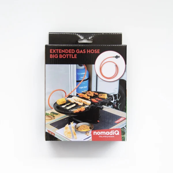 S to podaljševalno plinsko cevjo lahko svoj nomadiQ BBQ preko standardne razdelilne cevi nomadiQ z razdelilnikom tlaka (priložen v darilnem paketu nomadiQ BBQ) neposredno priključite na plinski ventil velike plinske jeklenke. Plinska cev je dolga 150 cm.