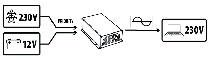• Pretvorba 12 V v 230 V čisto sinusno napetost