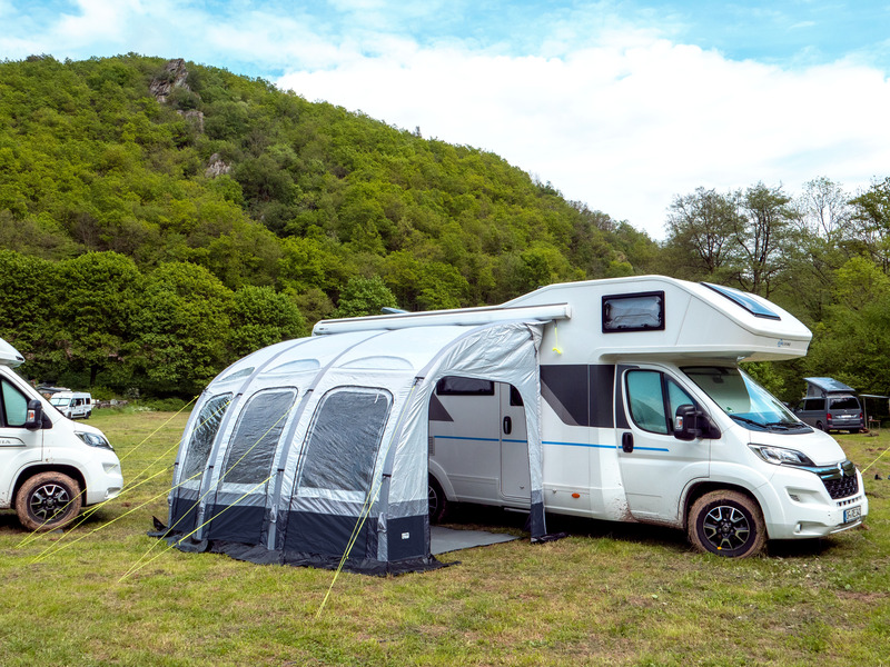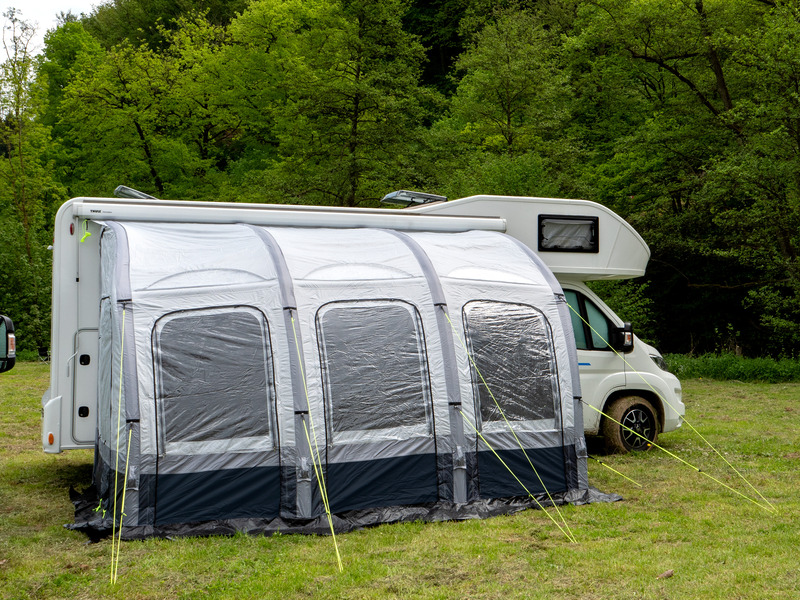 Zračne tende za avtodome Marina Air High v klasični zasnovi s samo eno zračno cevjo za hitro montažo in demontažo v vrhunski kakovosti. Sprednja stran s tremi velikimi okni je sestavljena iz treh plasti (prozoren PVC, mreža proti komarjem in notranji pokrov) in se lahko popolnoma odpre. Vse sprednje plošče je mogoče tudi odstraniti ali uporabiti kot markize. Stranske stene imajo vrata in okno z mrežo proti komarjem s pokrovom na zunanji strani.