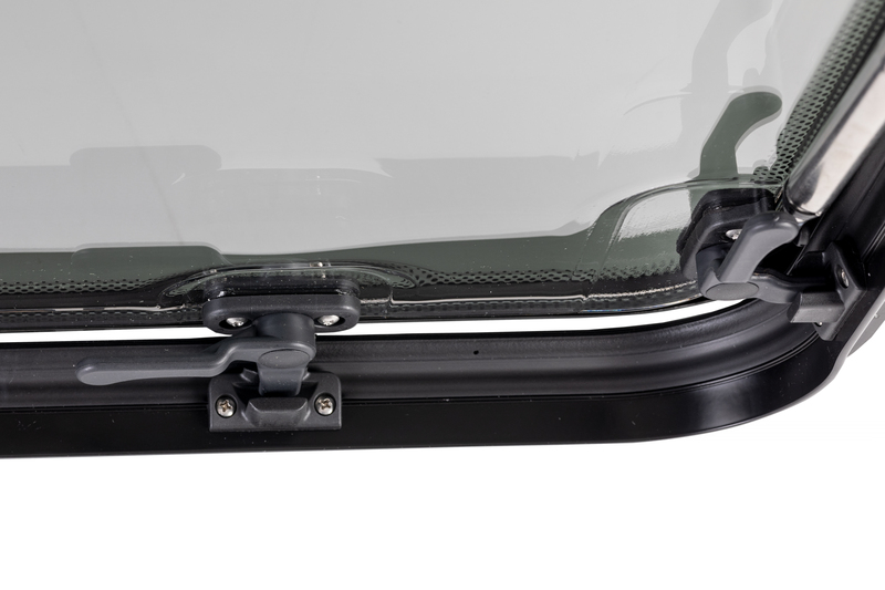 Novost v segmentu vozniških oken! Okno RW Fusion združuje pravo steklo na zunanji strani in akrilno steklo na notranji strani. AKRILNO STEKLO, VARNOSTNO STEKLO, DVOJNA ZASTEKLITEV, PREPUSTNOST SVETLOBE: 30 %, NAVZNOTER ZAOBLJENO STEKLO, ODPORNO NA UV-ŽARKE, Z ZRAČENJSKIM POLOŽAJEM, NASTAVLJIV JEKLEN IZPUSTNI MEHANIZEM (STOPENJSKO), MATERIAL OKVIRJA: ALU, ZA DEBELOST STENE 30–40 mm, VKLJUČNO Z MONTAŽNIM OKVIRJEM, RADIJ KOTOV OKVIRJA OKNA: 75 mm, ECE R43. Izrez B x H 500 x 300 mm, zunanji mera