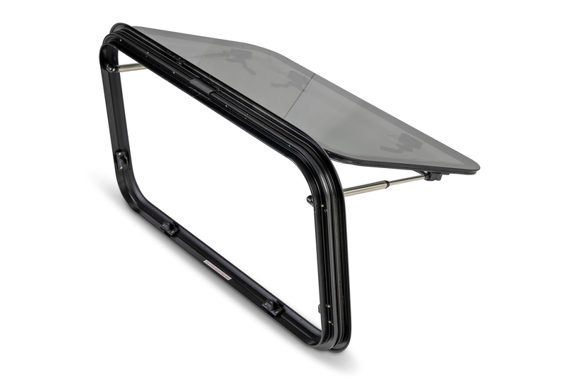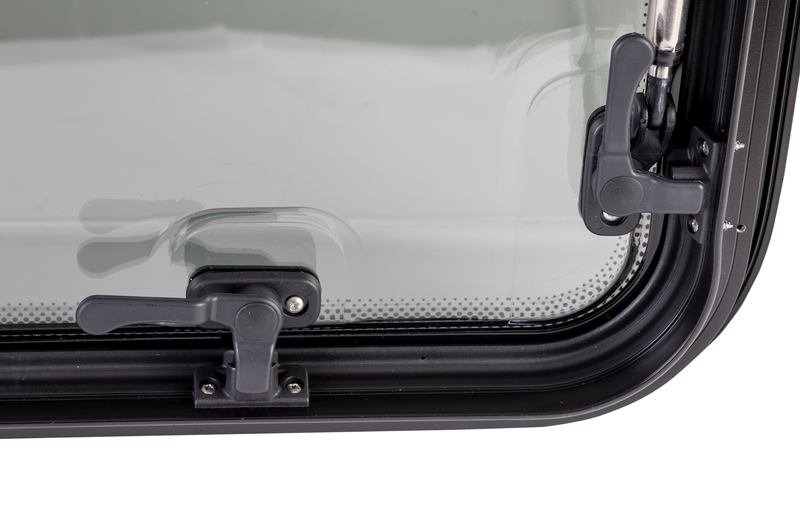 Novost v segmentu vozniških oken! Okno RW Fusion združuje pravo steklo na zunanji strani in akrilno steklo na notranji strani. AKRILNO STEKLO, VARNOSTNO STEKLO, DVOJNA ZASTEKLITEV, PREPUSTNOST SVETLOBE: 30 %, NAVZNOTER ZAOBLJENO STEKLO, ODPORNO NA UV-ŽARKE, Z ZRAČENJSKIM POLOŽAJEM, NASTAVLJIV JEKLEN IZPUSTNI MEHANIZEM (STOPENJSKO), MATERIAL OKVIRJA: ALU, ZA DEBELOST STENE 30–40 mm, VKLJUČNO Z MONTAŽNIM OKVIRJEM, RADIJ KOTOV OKVIRJA OKNA: 75 mm, ECE R43. Izrez B x H 350 x 500 mm, zunanji mera