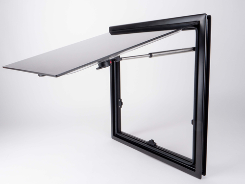 Zatemnjeno okno na tečajih, aluminijast okvir, zunanja stran ravna, s funkcijo zaklepanja